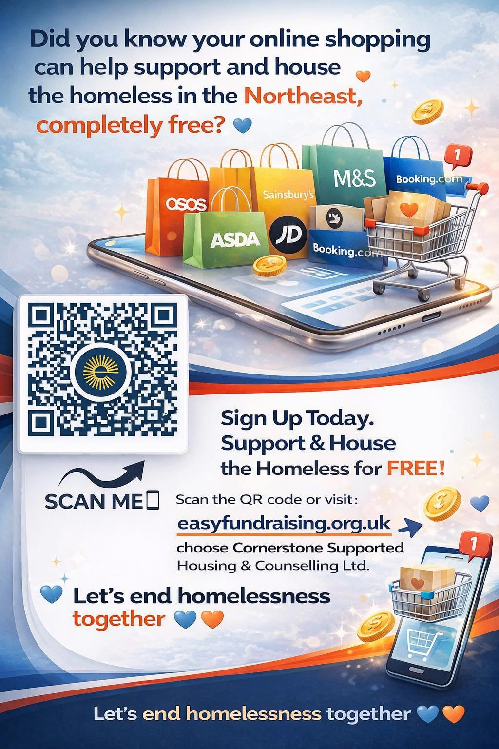 We’ve teamed up with easyfundraising.org.uk, where over 8,000 retailers donate every time you shop. From everyday essentials to big purchases, you can raise free donations simply by shopping online. Sign up today and choose Cornerstone Supported Housing and Counselling Ltd as your cause.